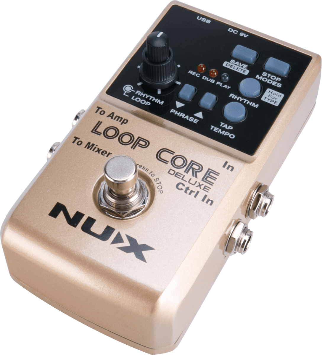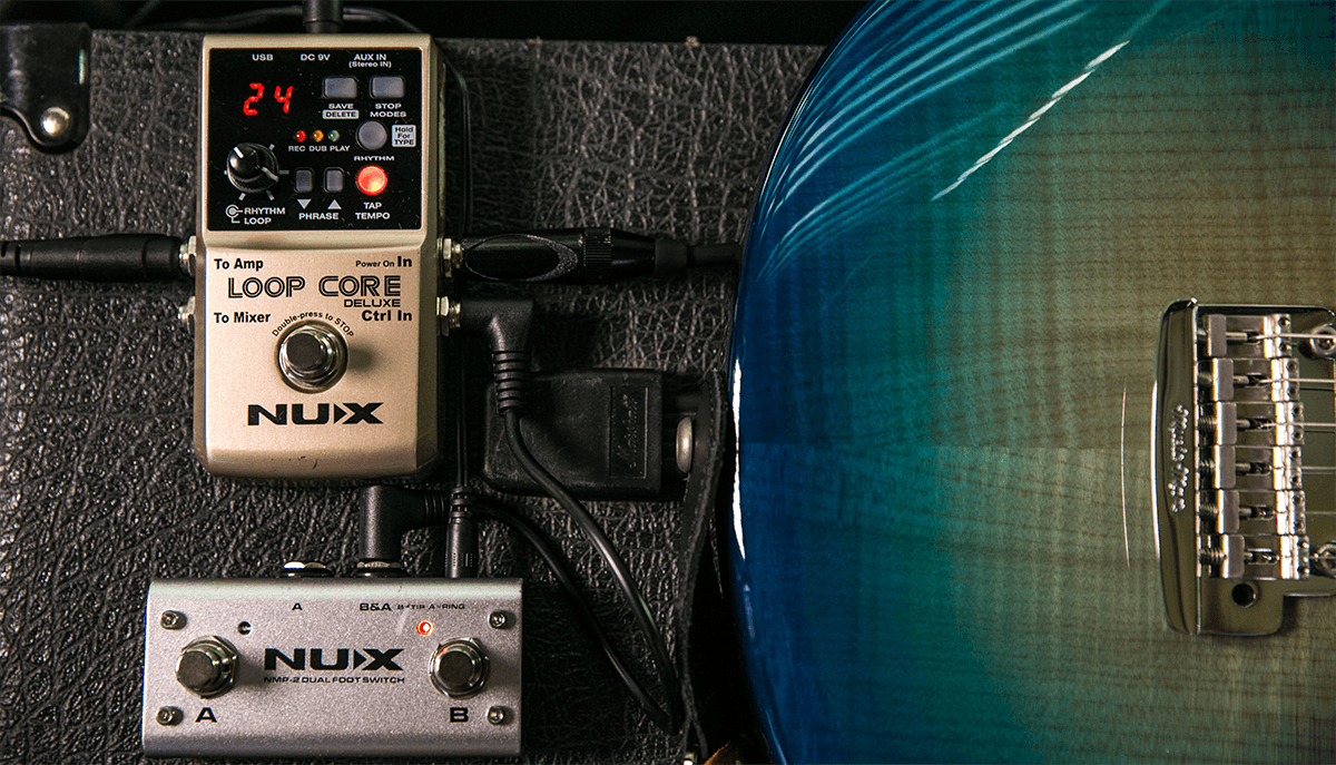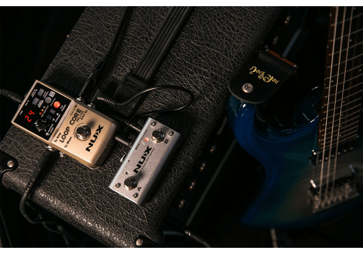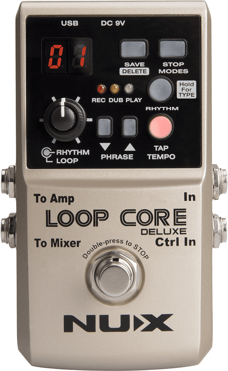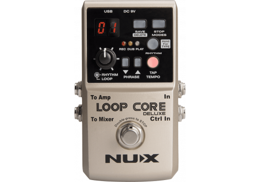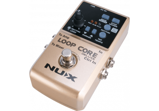 Der Loop Core Deluxe ist eine verbesserte Version des NUX Loop Core. Zusätzlich zur Looper-Funktion, die bis zu 8 Stunden Spielzeit auf dem integrierten Speicher aufzeichnen kann, besitzt der Loop Core Deluxe auch eine sehr umfangreiche Drum-Machine mit sehr realistischen Drum-Sounds. Er ist per Tap-Tempo steuerbar und bietet 20 verschiedene Musikstile.