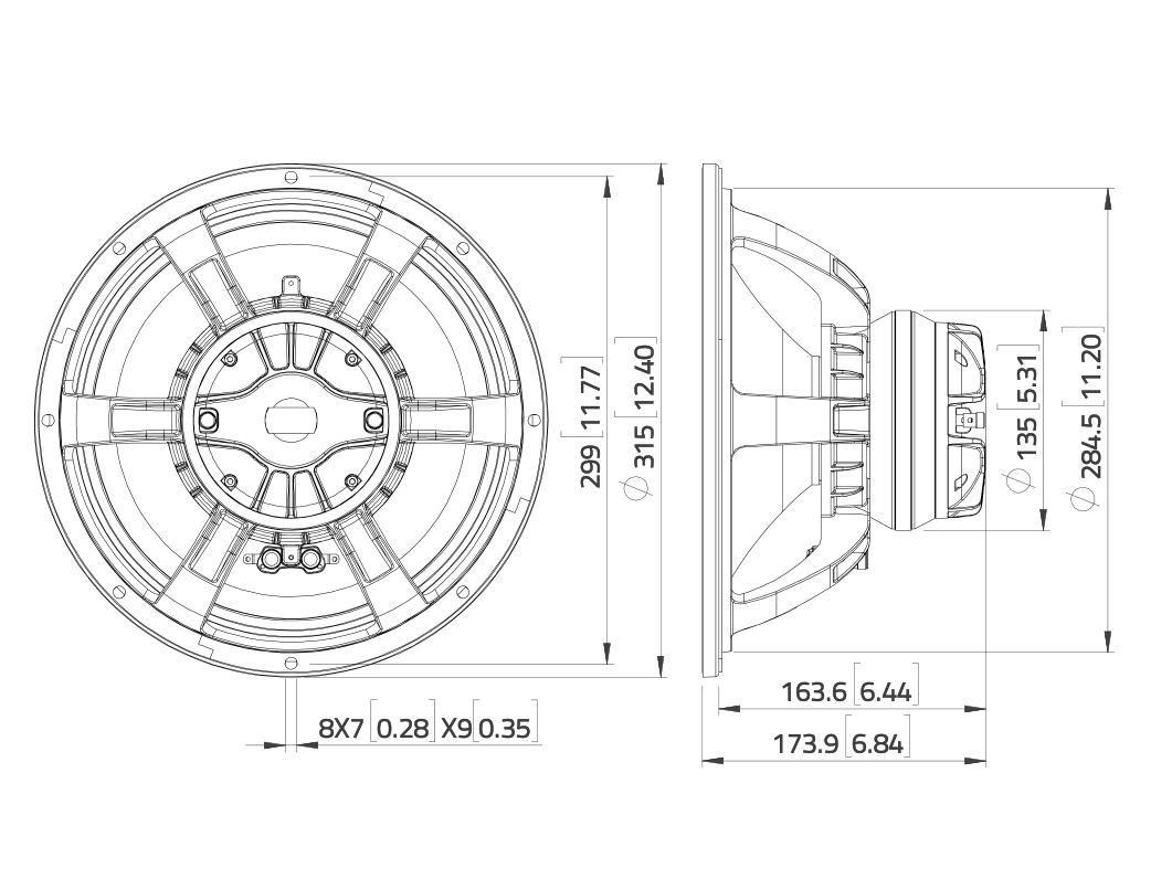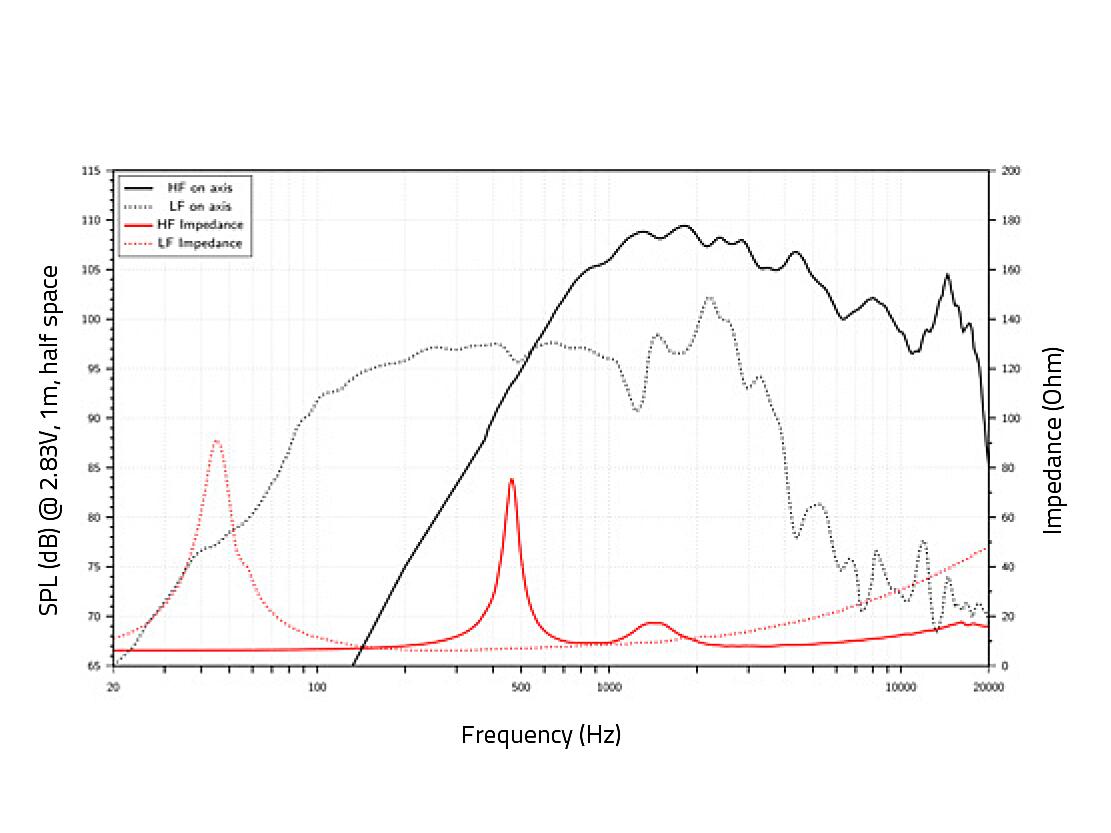 350 W AES LF/80 W AES HF, 8 Ohm LF/8 Ohm HF, 99,5 dB LF/105,5 dB HF, 45-3500 Hz LF/600-18000 Hz HF