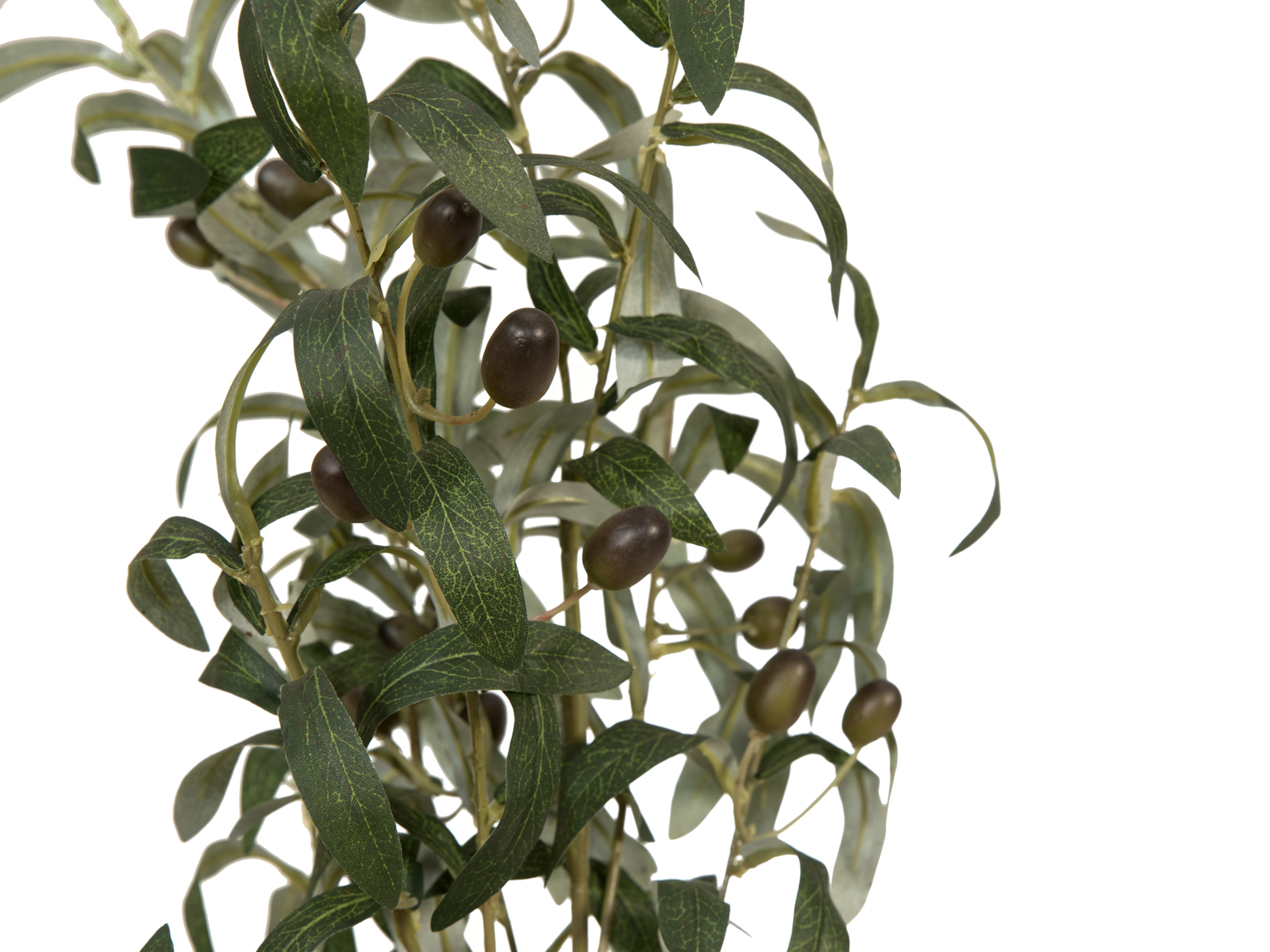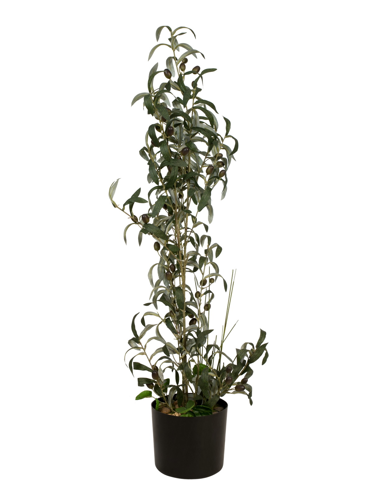 Der ca. 104 cm hohe immergrüne Olivenstrauch von Europalms verleiht selbst nüchtern eingerichteten Büro- und Wohnräumen ein mediterranes Flair. Er fällt beim Aufstellen bereits von selbst in Form.Echte Olivenbäume zählen zur Familie der Ölbaumgewächse. Sie werden bereits seit vielen Jahrhunderten kultiviert und gehören zu den ältesten bekannten Nutzpflanzen.Bei der Herstellung der Kunstpflanze wurde sehr viel Wert auf naturgetreue Details gelegt: So zum Beispiel die typische Blattgestaltung mit silbern schimmernder Unterseite und Oliven, die den unterschiedlichen Reifegrad der Früchte in verschiedenen Farbabstufungen anzeigen.Als Abdeckung des im Lieferumfang enthaltenen Basis-Gärtnertopfs dienen eingearbeitete Kieselsteine und künstliches Moos. Somit kann er sowohl als Standhilfe für einen Übertopf dienen, als auch als Deko-Topf verwendet werden.